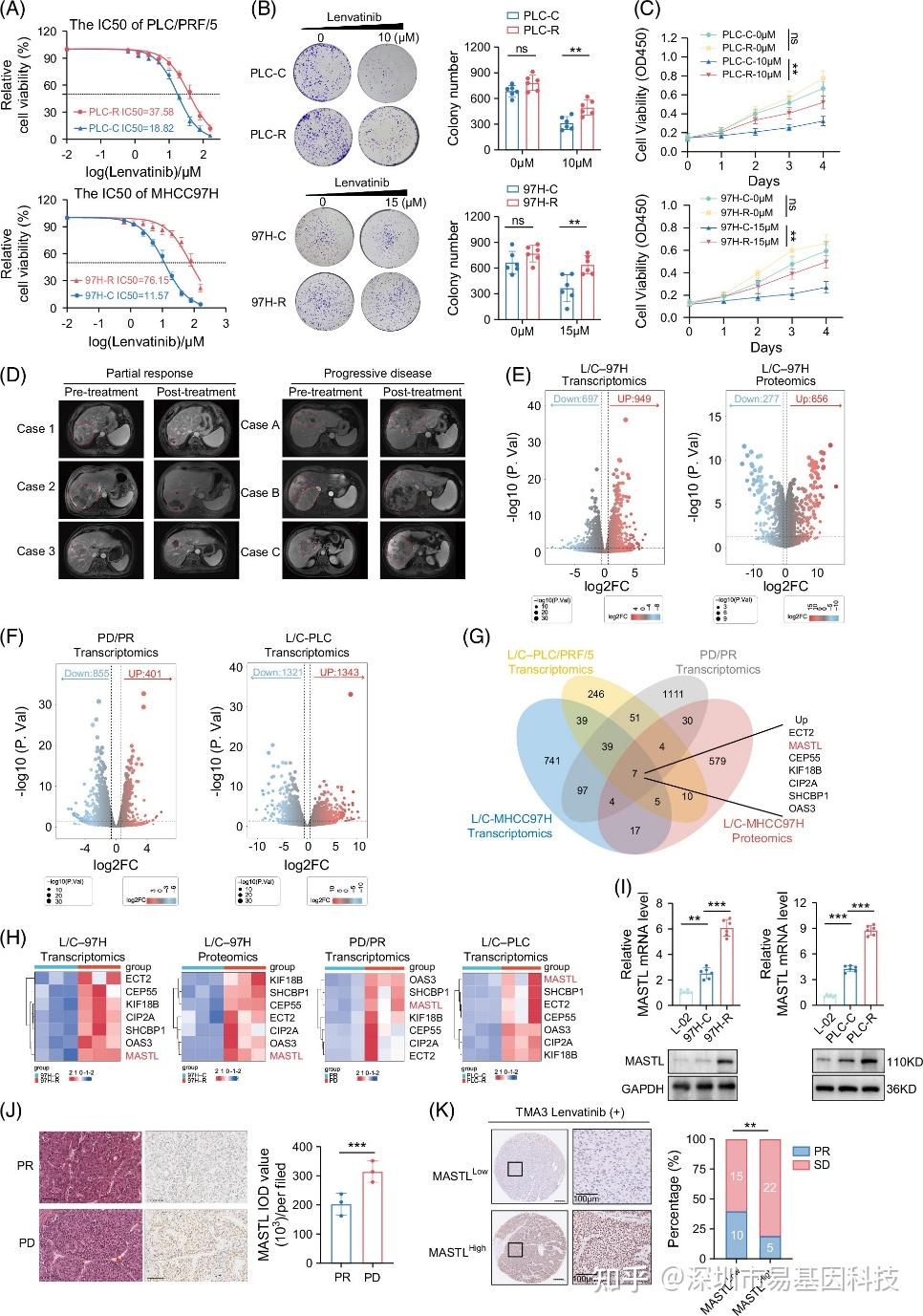研究者们首先通过转录组和蛋白质组测序分析,比较分析了仑伐替尼耐药细胞系(PLC-R和97H-R)与对照细胞系(PLC-C和97H-C)的基因表达和蛋白表达差异。分析结果表明,在97H-R vs 97H-C细胞系、PLC-R vs PLC-C 细胞系以及临床耐药与敏感 HCC 组织样本之间,均存在大量差异表达基因。通过火山图筛选出符合特定条件(|log2FC|>1且p值<0.05)的DEGs,利用韦恩图分析发现7个在不同耐药细胞系和组织样本中均上调的基因,并鉴定出MASTL在多种癌症中与治疗耐药相关,且在本研究的耐药细胞系和组织样本中表达显著升高,进一步通过免疫组化(IHC)分析临床HCC组织样本,揭示MASTL高表达患者中仑伐替尼治疗耐药比例更高,表明MASTL与仑伐替尼耐药密切相关。