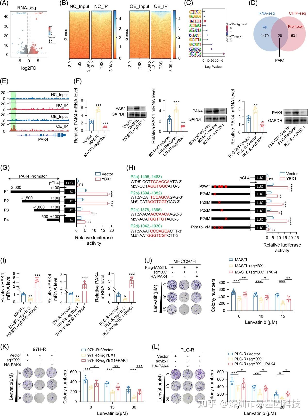 图5:磷酸化的YBX1通过转录激活PAK4促进仑伐替尼耐药。