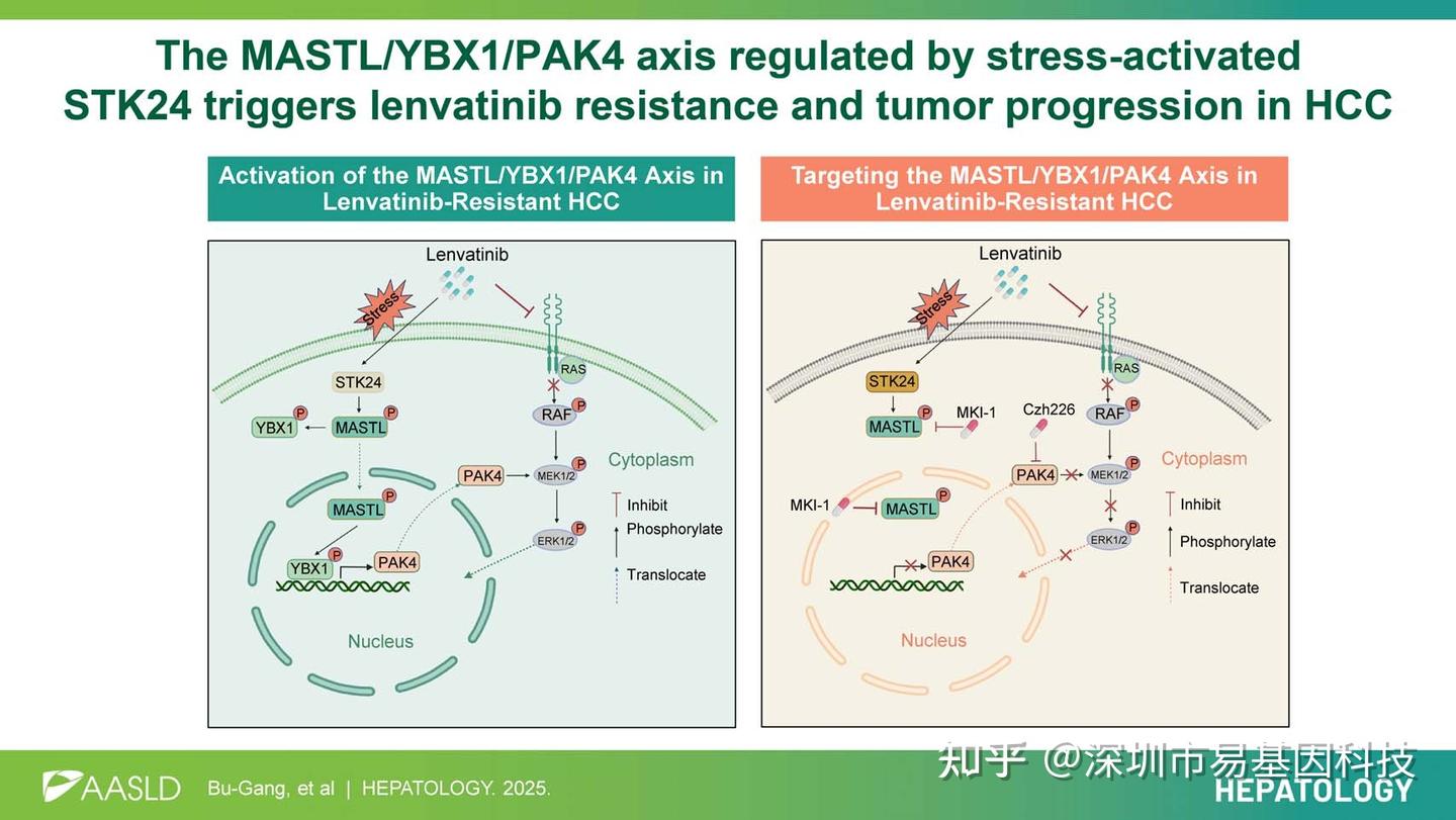 本研究结果表明,由应激诱导的STK24激活MASTL/YBX1/PAK4轴在仑伐替尼耐药中发挥关键作用。通过靶向MASTL抑制该轴可有效克服HCC中的仑伐替尼耐药。