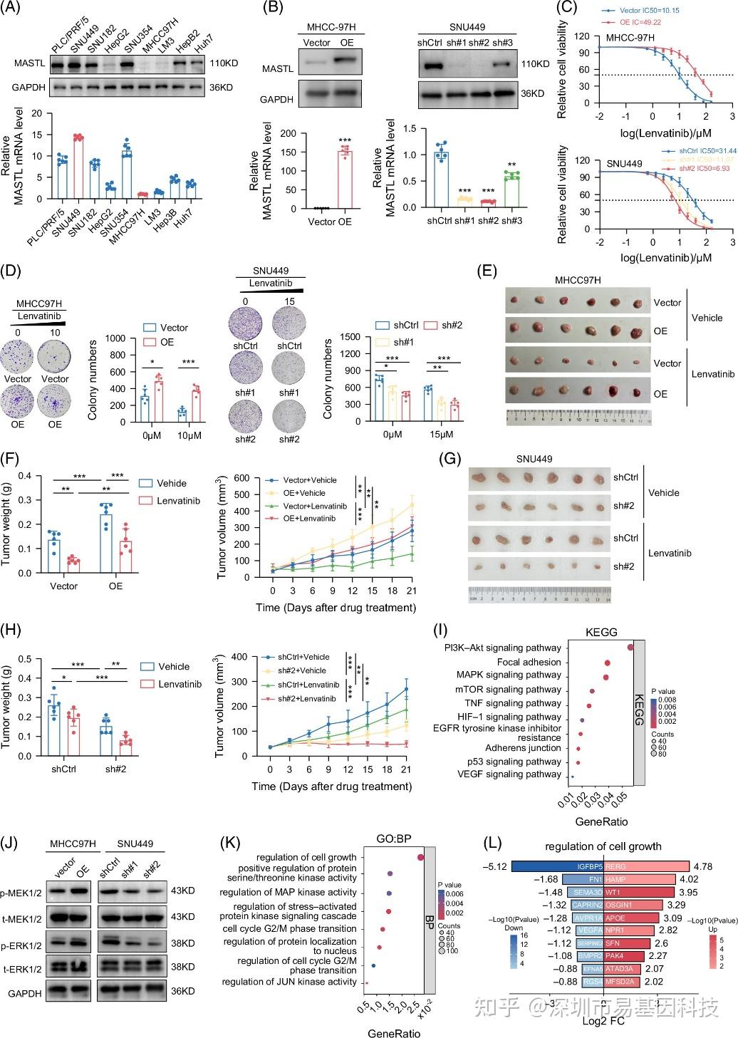 (I)气泡图显示MASTL过表达细胞系的KEGG通路分析结果。