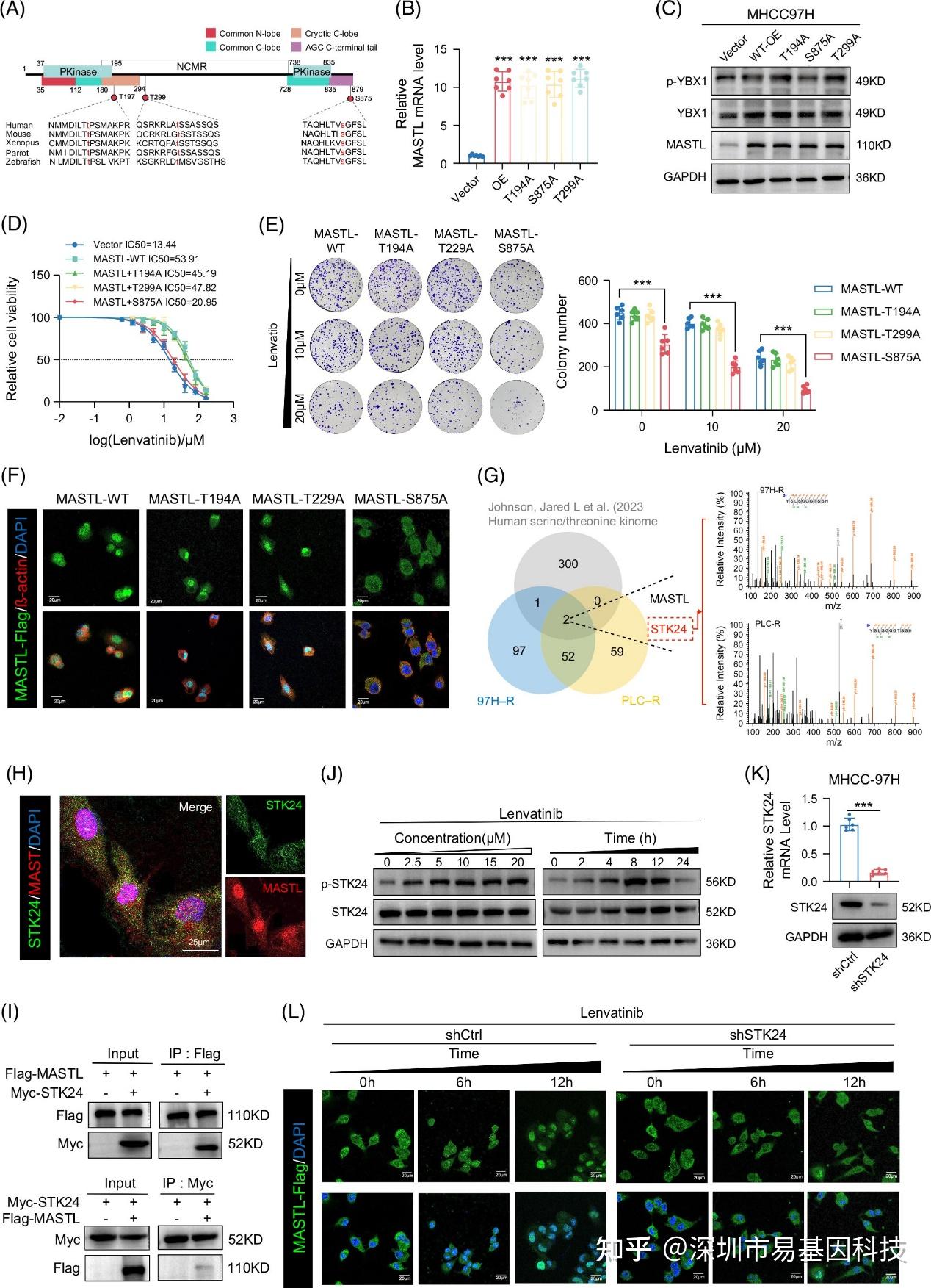 MASTL存在多个磷酸化位点,其中T194、T299和S875是常见的保守位点。研究通过构建MASTL位点特异性突变体,发现S875位点突变显著削弱了MASTL对YBX1的磷酸化能力,表明S875对MASTL的激酶活性至关重要。此外S875突变还降低了细胞对仑伐替尼的耐药性,并抑制MASTL核转运。结合之前研究数据,推测STK24可能是负责磷酸化MASTLS875位点的蛋白激酶。免疫荧光染色和免疫共沉淀实验揭示MASTL与STK24之间的结合互作。已有研究表明,STK24在氧化应激和缺氧条件下可被磷酸化激活,而这些条件通常由多种药物诱导。本研究发现,仑伐替尼处理能够以剂量和时间依赖性方式激活STK24磷酸化。免疫荧光染色结果显示,STK24敲低显著降低MASTL核转运效率,提示STK24可能确实影响MASTL S875的磷酸化,进而调控MASTL功能。