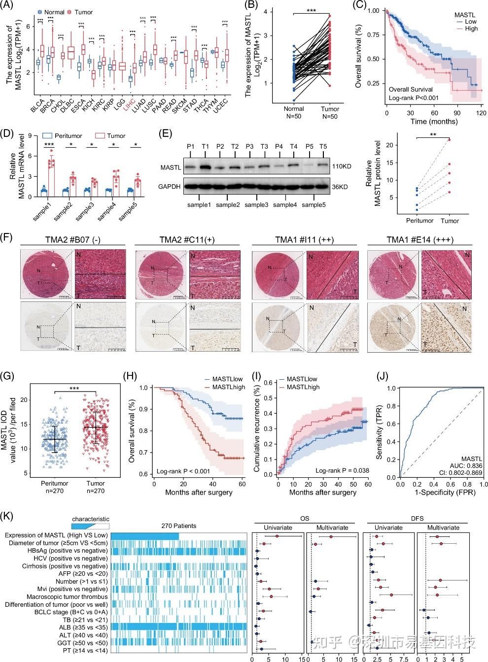 (K)热图显示按MASTL表达分组的270例HCC患者的临床病理特征。森林图显示通过单变量和多变量Cox比例风险回归分析确定的各种表征对OS和DFS的作用。所有实验至少重复3次。