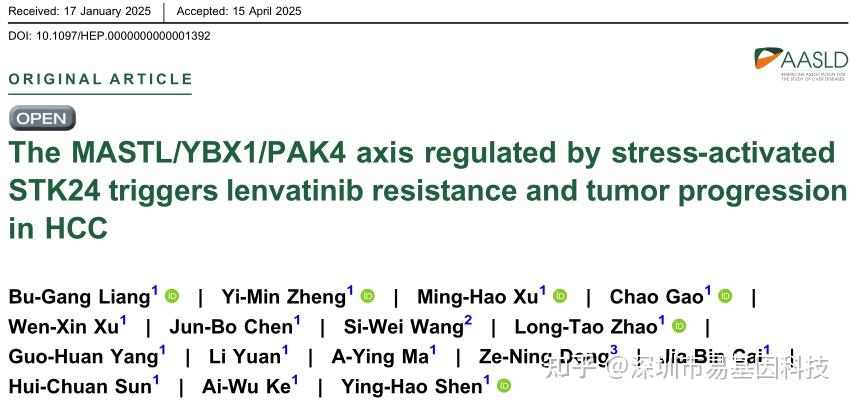 近日,复旦大学附属中山医院liang bugang、郑懿民等为并列第一作者,沈英皓、柯爱武为共同通讯作者,在《Hepatology》杂志发表了题为“The MASTL/YBX1/PAK4 axis regulated by stress-activated STK24 triggers lenvatinib resistance and tumor progression in HCC”的科研论文。该研究聚焦肝细胞癌(Hepatocellular carcinoma, HCC)中仑伐替尼(Lenvatinib)耐药这一临床难题,通过一系列实验探究了其耐药机制。研究利用转录组和蛋白质组测序分析,揭示了微管相关丝氨酸/苏氨酸激酶样蛋白(Microtubule-associated serine/threonine kinase-like, MASTL)在仑伐替尼耐药的 HCC 细胞和组织中高表达,并通过染色质免疫共沉淀测序(ChIP-seq)等研究进一步揭示应激激活的丝氨酸/苏氨酸蛋白激酶 24(Serine/threonine protein kinase 24, STK24)调控的 MASTL/YBX1/PAK4 轴在 HCC 中介导仑伐替尼耐药和肿瘤进展的关键作用,为突破HCC 仑伐替尼耐药提供了潜在的治疗靶点。易基因为本研究提供了ChIP-seq技术服务,助力揭示MASTL信号轴在耐药中的关键作用。