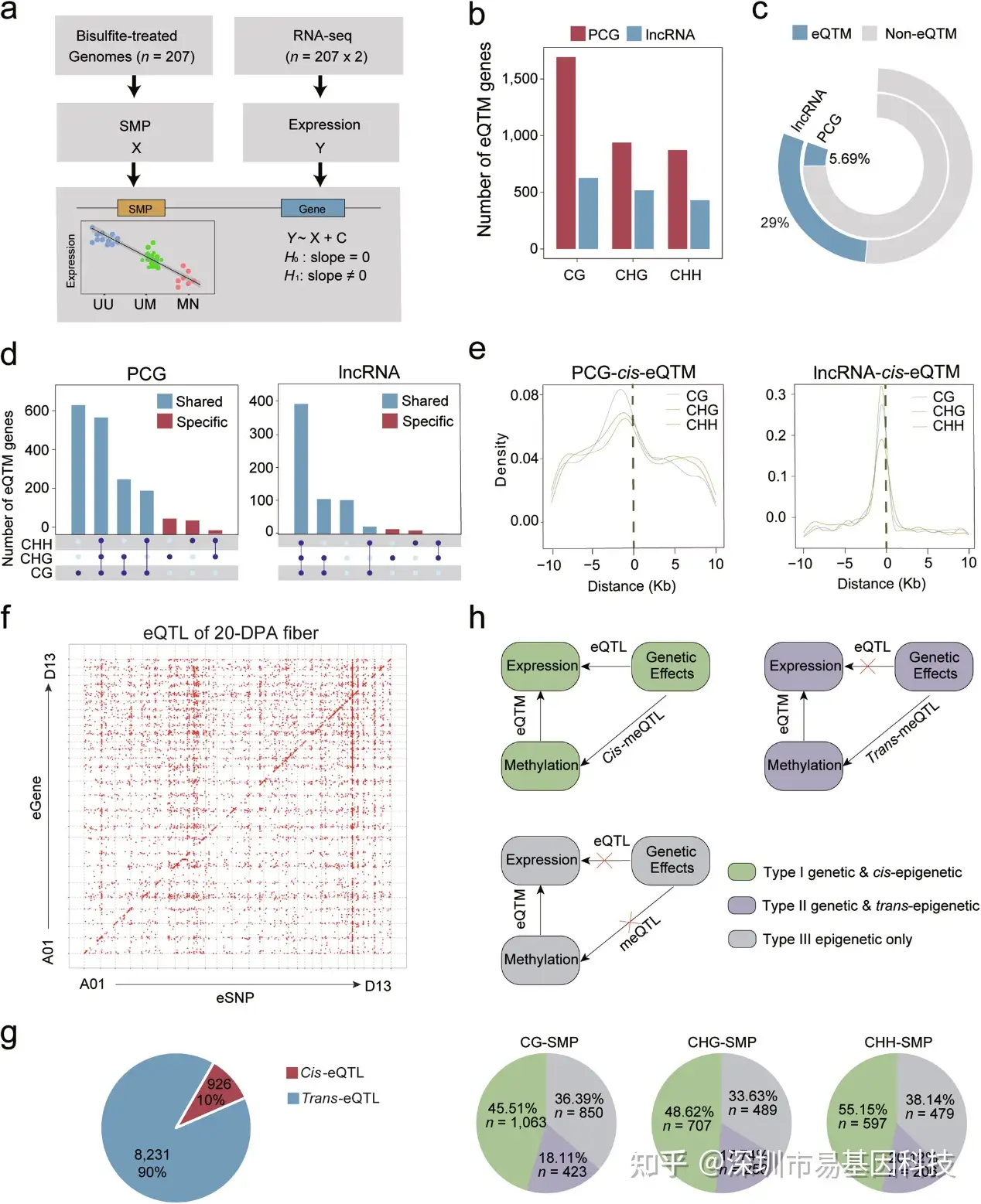 b.在PCGs和lncRNAs中鉴定出的顺式eQTMs数量。