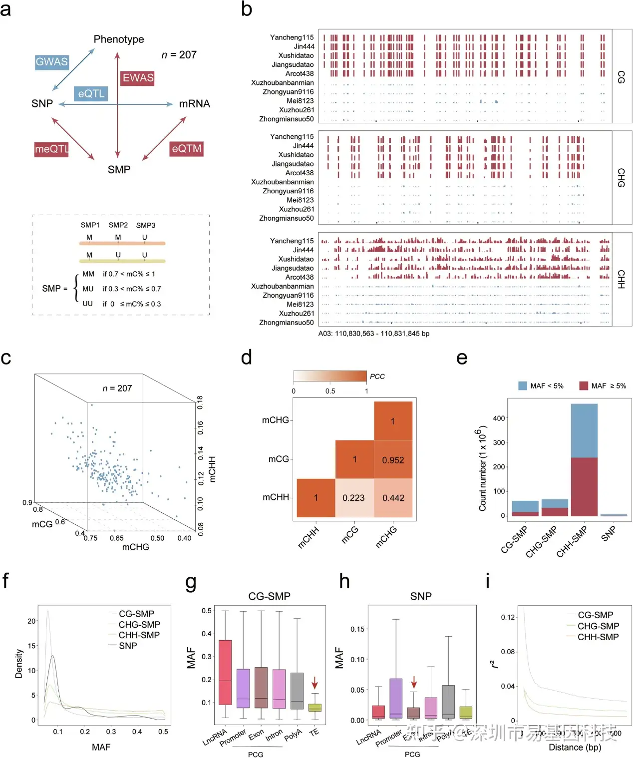 f.密度图展示CG、CHG、CHH-SMPs和SNPs的MAF分布。