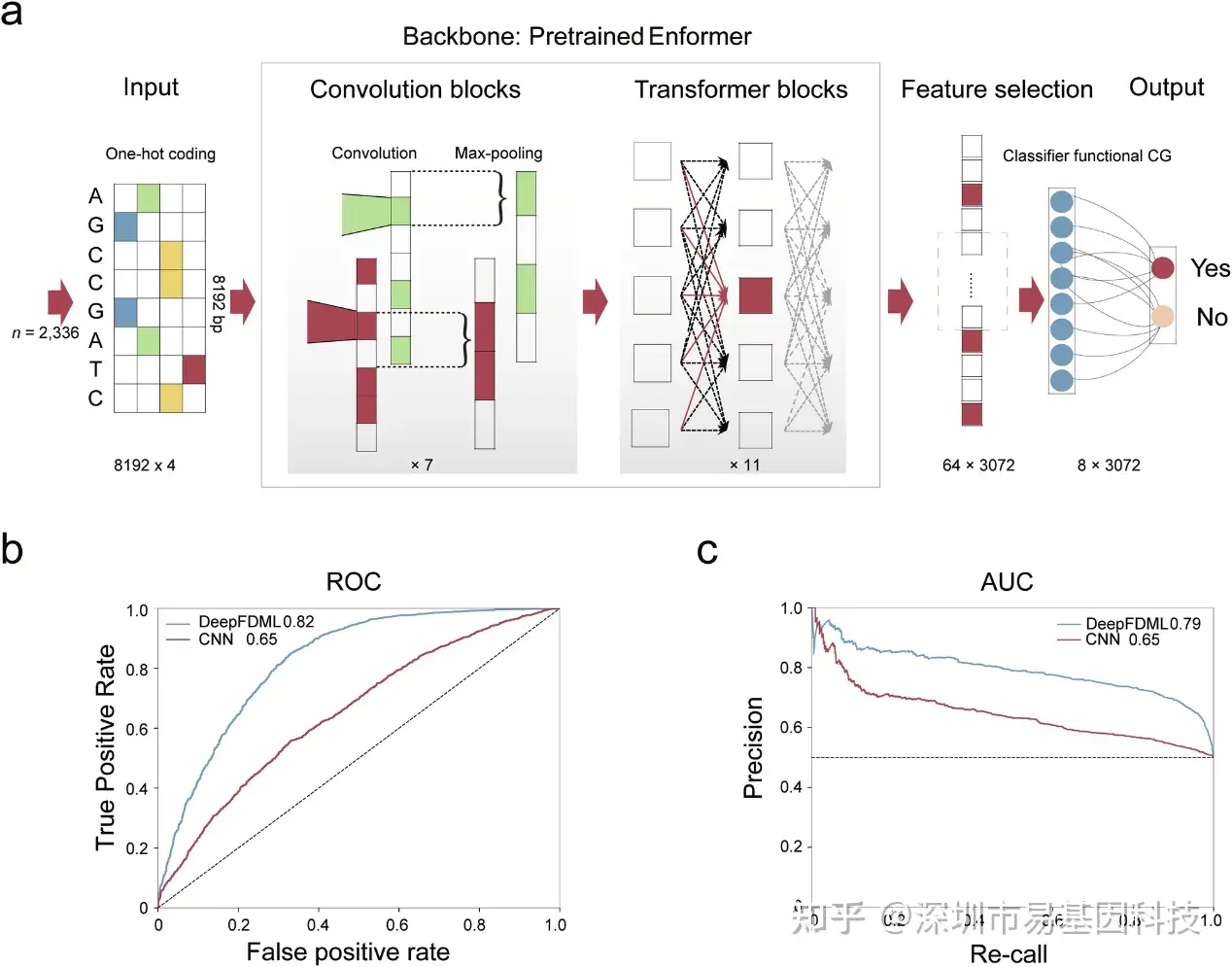 a.所提出的深度学习方法的流程示意图。它主要包括四个部分:input序列、主干网络、特征选择和output层。每个input是一个以CG位点为中心的8192bp的DNA序列,经过one-hot encoding处理。主干网络采用预训练的Enformer模型。在特征选择阶段,利用了中间八个位置的特征。output层是一个作为二元分类器的全连接层。