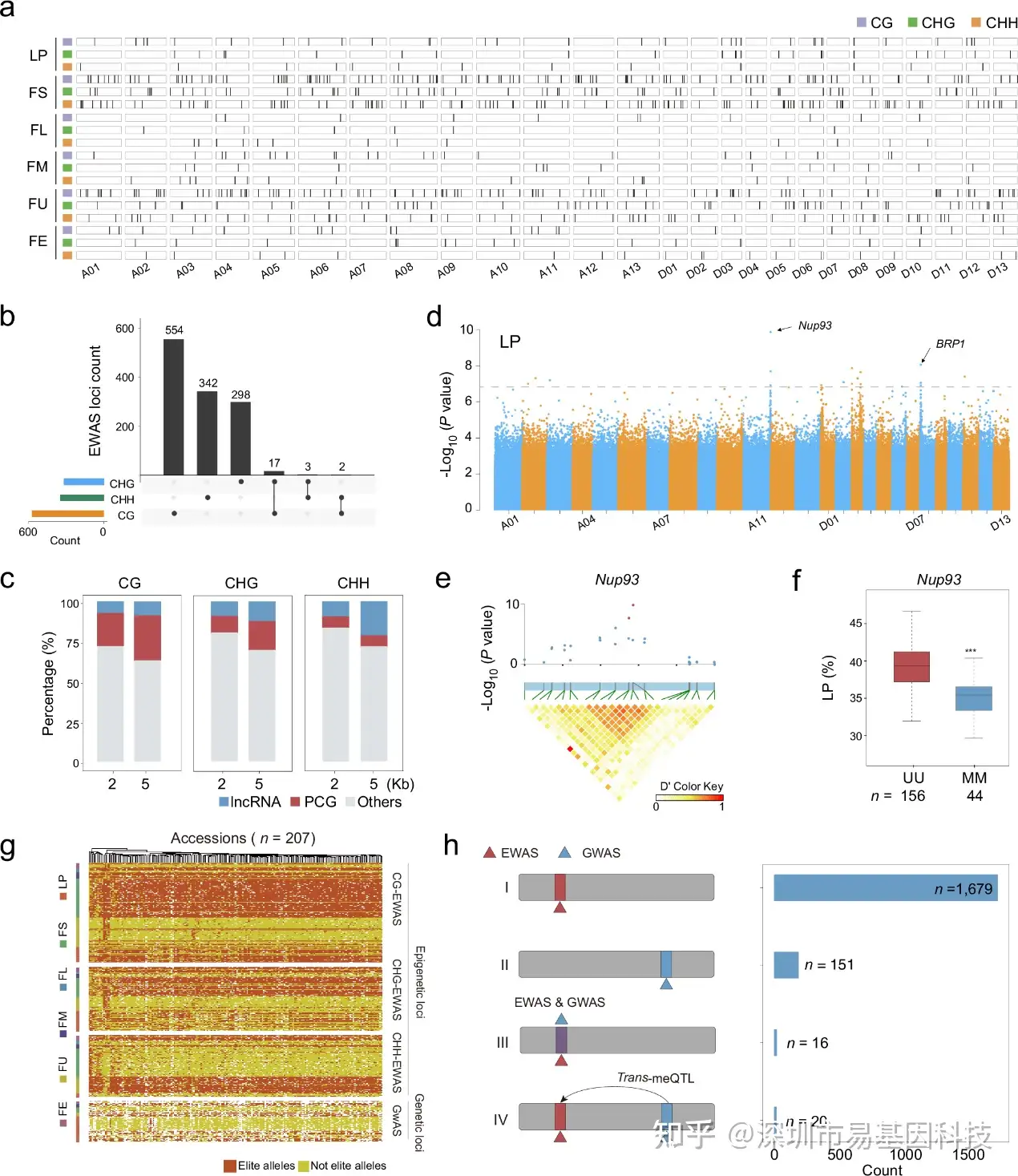 研究人员利用SMPs进行了表观基因组关联研究(EWAS),鉴定出1715个与纤维产量和品质性状相关的表观遗传位点。其中,1010个位点与产量相关性状相关,705个位点与纤维品质性状相关。这些表观遗传位点中,只有16个(0.93%)与GWAS位点重叠。例如,研究人员在A11染色体上发现了一个与衣分(lint percentage, LP)相关的表观遗传位点,该位点位于一个编码核孔复合体相互作用组分(Nup93)的基因启动子区域。不同表观等位基因对应的LP值存在显著差异。这些结果表明,DNA甲基化为农艺性状提供了额外的调控层,并且大多数表观遗传位点与遗传变异独立存在。