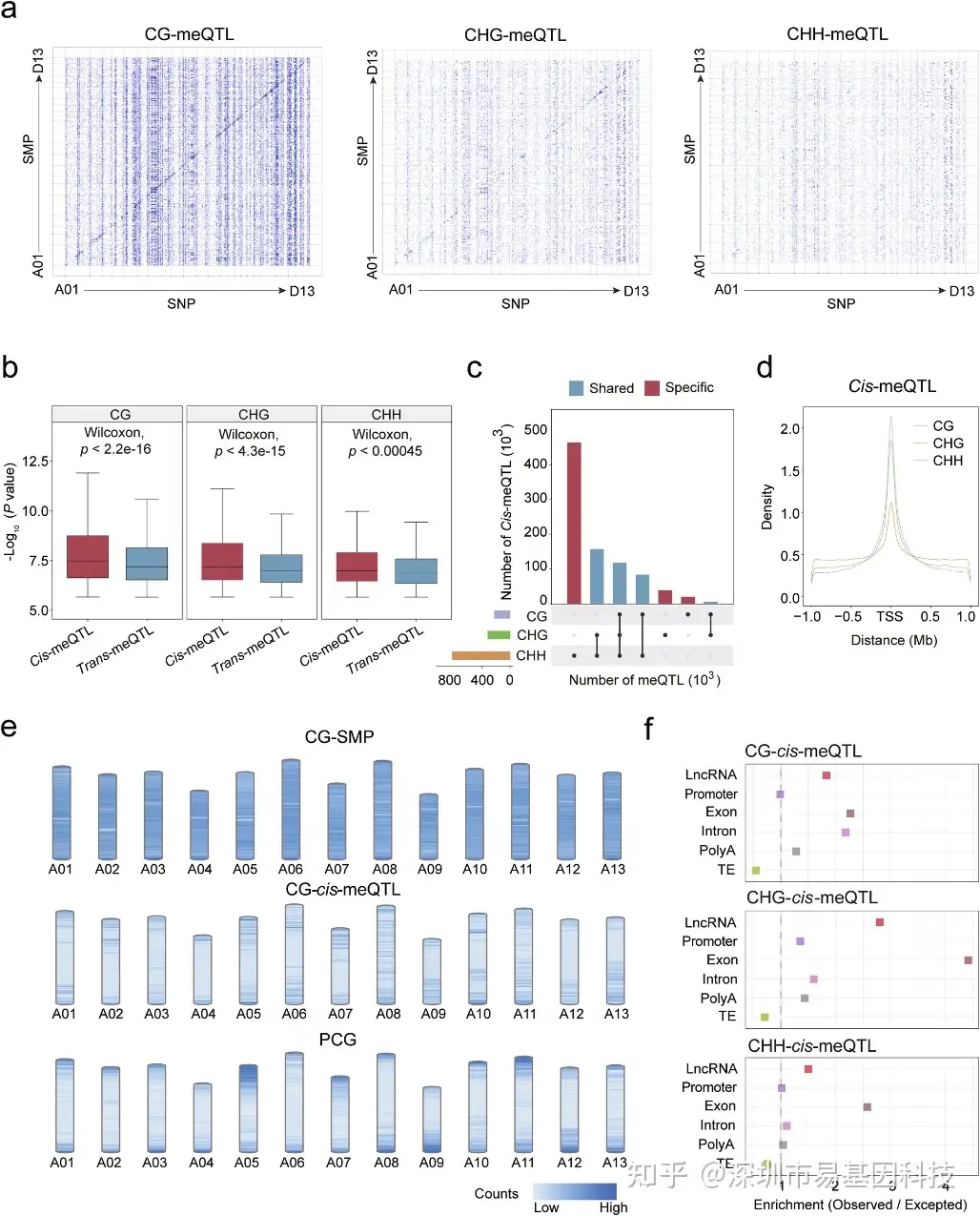 研究人员进一步分析了遗传变异对DNA甲基化的作用。通过全基因组随机抽样,研究人员在CG、CHG和CHH三种甲基化背景下分别鉴定出119,685、37,831和24,683个甲基化数量性状位点(meQTLs)。其中,顺式meQTLs(cis-meQTLs)表现出更强的显著性。研究人员对所有SMPs进行了顺式meQTL分析,共鉴定出5,426,782个顺式meQTLs,包括940,794个CG-cis-meQTLs、883,280个CHG-cis-meQTLs和3,602,708个CHH-cis-meQTLs。这些顺式meQTLs在基因组中的分布不均匀,特别是在染色体末端密度较高。此外,顺式meQTLs在基因内区域显著富集,而在TEs中则显著缺失。这些结果表明,基因富集区域的遗传变异对DNA甲基化具有重要影响。