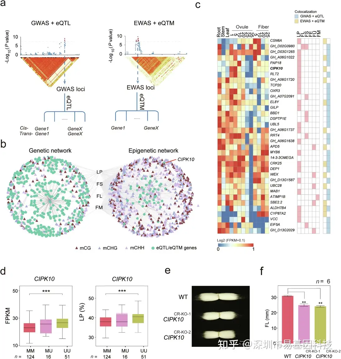b.调控棉花纤维性状的基因网络。右侧:通过整合GWAS和eQTL构建的遗传变异依赖网络;左侧:通过整合EWAS和eQTM构建的表观遗传调控网络。