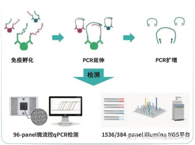 邻近延伸分析 (PEA) 是一种超多重免疫分析(包括48,96,384,1536和3072重指标规格),用于高通量检测液体样品中的蛋白质生物标志物。 对于每个生物标志物,都设计并筛选出独特的一对匹配抗体与之临近的两个抗原表位结合,每一个抗体重链标记有互补的寡核苷酸探针。当特异性结合靶蛋白时,探针非常接近并相互杂交。 添加 DNA 聚合酶导致杂交寡核苷酸的延伸,与探针之一结合,产生 DNA 扩增子,随后可以通过定量实时 PCR 或 NGS 检测和量化。