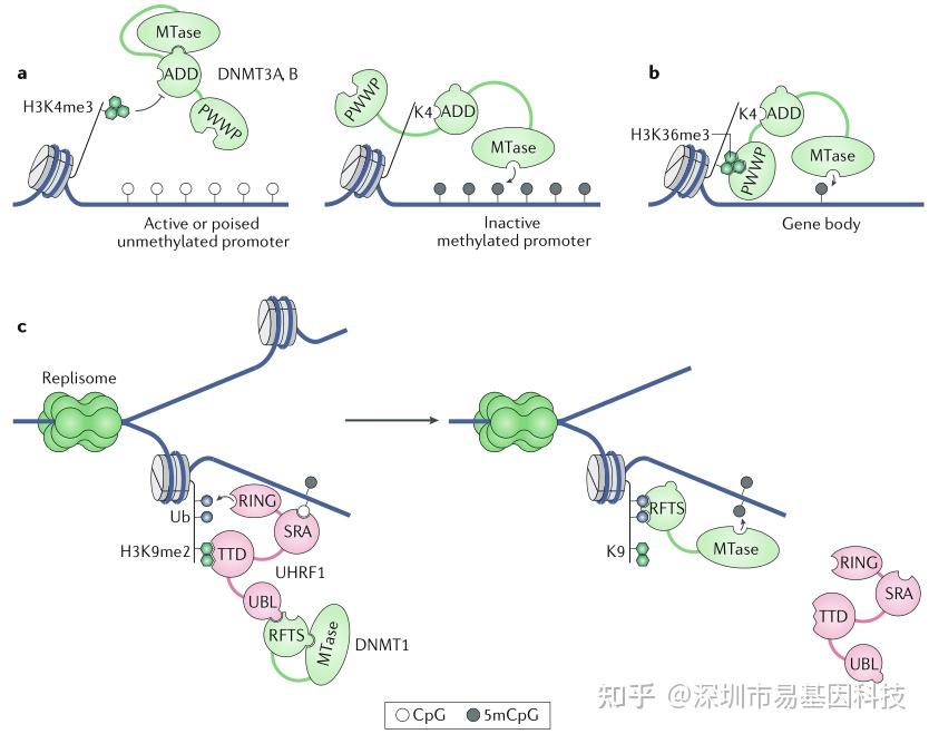 c.DNA甲基化的维持机制。左图:E3泛素连接酶UHRF1通过其SRA域(识别半甲基化CpG位点)和TTD域(结合H3K9me2)被招募至复制中的DNA。UHRF1的RING域泛素化修饰组蛋白H3尾部(Ub)。DNMT1的复制焦点靶向序列(RFTS)折叠至MTase域,抑制其催化活性。UHRF1通过其泛素样(UBL)域与DNMT1的RFTS互作,招募DNMT1。右图:当RFTS结合泛素化H3尾部时,DNMT1的自抑制解除,从而维持CpG位点的对称性甲基化。
