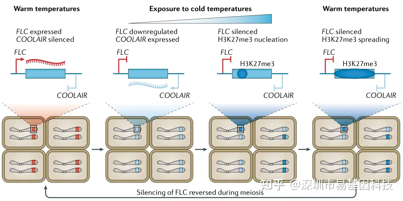 温度季节性变化通过表观遗传重编程拟南芥FLC位点,确保开花时间的精确调控。在初始温暖条件下,FLC在每个细胞中表达,而反义转录本COOLAIR受到抑制。当温度转冷时,未知信号诱导COOLAIR表达,由于COOLAIR与FLC表达互斥,导致FLC表达下调。细胞中每个FLC拷贝独立调控,因此局部染色质变化调控正义与反义转录转换。COOLAIR转录本在顺式作用中形成云状结构包围FLC位点。COOLAIR的3'端由FCA复合体加工,该复合体与染色质重塑复合体互作,最终导致H3K36me3水平降低。H3K36me3与H3K27me3具有拮抗作用,因此COOLAIR转录终止可能为H3K27me3获得创造条件。随着低温持续,每个细胞中每个基因拷贝通过独立随机过程,由PcG蛋白在第一个外显子和第一个内含子起始处的三个核小体组成的成核位点沉积H3K27me3,使FLC沉默。单细胞中单FLC等位基因对低温响应的转换频率较低,意味着需要数周时间才能使所有细胞转为沉默状态。这种全株基因拷贝的二元开关转化为整株植物冷暴露的量化指标。最终当温度回暖时,H3K27me3通过DNA复制依赖性过程扩散至整个FLC位点,导致FLC稳定沉默,直至下一代植株形成前重置。
