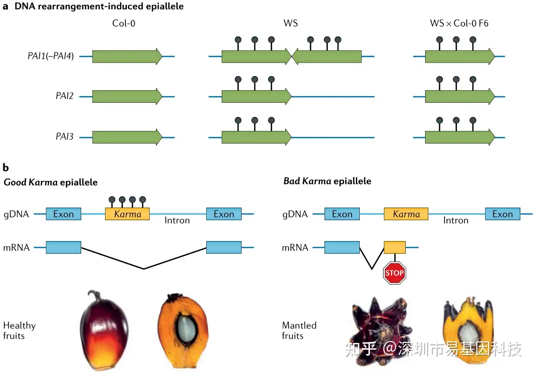 - 油棕植物中的表观等位基因现象。高产油棕杂交种通常通过组织培养(而非亲本杂交)繁殖,这种组织培养可能偶尔产生“Bad Karma”表观等位基因。在含有“Good Karma”表观等位基因的野生型植物中,油棕DEFICIENS基因内含子中的Karma型转座元件高甲基化。而在组织培养繁殖产生的“Bad Karma”表观等位基因中,该转座元件DNA甲基化丢失,导致转座元件内部提前终止转录,随后剪接机制利用转座元件内的3′剪接位点产生截短的转录本,编码提前终止密码子,最终引发植物发育异常。