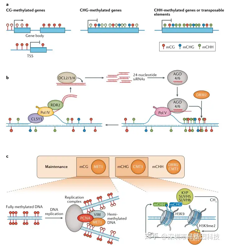 CHH甲基化基因:富含mCHH,可能含CG和CHG甲基化,通常沉默,其状态类似转座子相关的DNA甲基化(通常同时存在mCG、mCHG和mCHH)。 - 三种序列的DNA甲基化建立可通过RNA介导的DNA甲基化(RdDM)实现,通过产生小RNA靶向特定位点进行甲基化。简要过程:RNA聚合酶IV(Pol IV)和RDR2在CLSY1等蛋白引导下生成双链RNA;DCL2-4将其切割为小干扰RNA(siRNA);siRNA引导AGO4/6结合Pol V产生的染色质结合转录本,招募DNA甲基转移酶DRM2(动物DNMT3同源蛋白,其甲基转移酶结构域基序发生重排)。