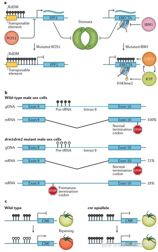 图2a展示了拟南芥中DNA甲基化模式的维持对于正常生长和发育的重要性,特别是对于开花时间等性状的调控。这些研究结果表明,DNA甲基化变化不仅与发育相关,而且在某些情况下是发育所必需的。