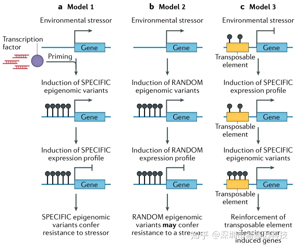 - 模型3:植物经历的胁迫可诱导胁迫响应性转录程序。在启动这一新转录程序后,可在邻近转座元件位点诱导表观基因组变化以确保其持续被抑制,从而将表观基因组变化作为转录变化的启动因果关系逆转。