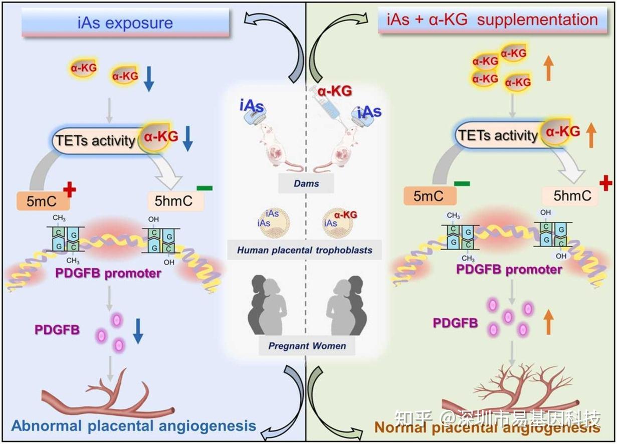 研究揭示了砷暴露对胎盘血管生成的抑制作用,并阐明了其潜在的分子机制,即砷暴露通过抑制TET活性和α-KG含量,改变Pdgfb基因启动子的甲基化和羟甲基化模式,作用PDGFB表达下调,最终抑制胎盘血管生成。