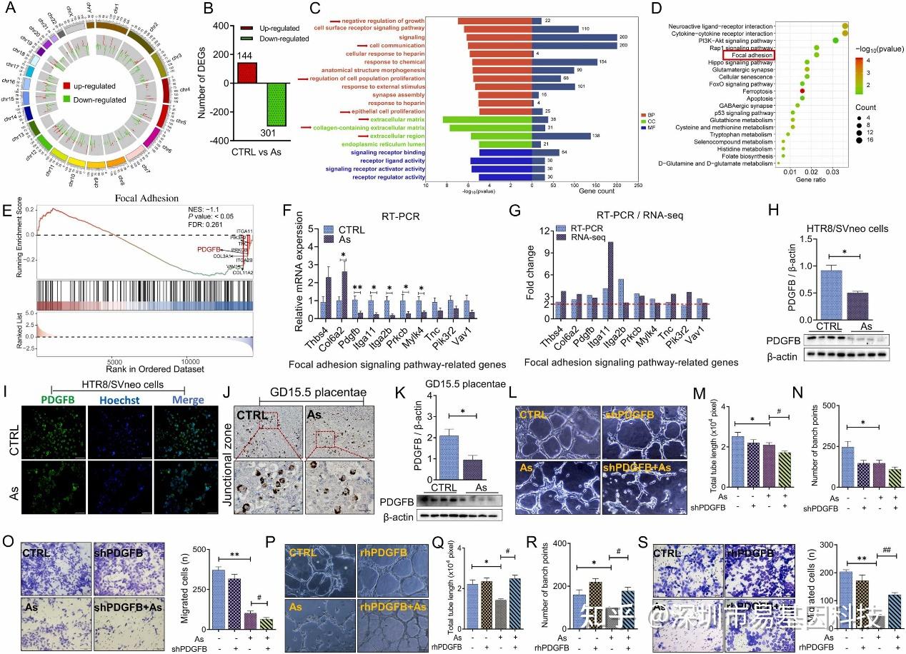 RNA-seq发现砷处理组301个基因下调,144个上调,GO分析显示PDGFB富集于血管生成相关通路。RT-PCR和免疫印迹验证PDGFB在砷暴露的胎盘和细胞中表达均降低,提示PDGFB是砷抑制血管生成的核心靶点。