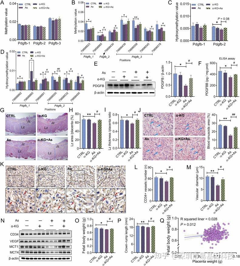 α-KG补充实验:在砷暴露的HTR8/SVneo细胞系和小鼠中添加二甲基-α-KG(Dm-αKG)或α-KG,观察其对Pdgfb表观遗传修饰和血管生成能力的改善效果。