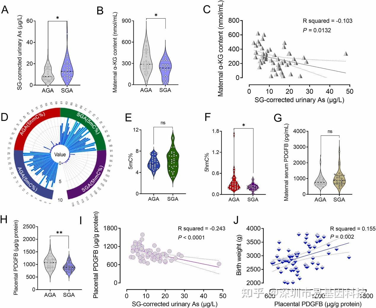 SGA婴儿的母体血清α-KG含量低于AGA婴儿,母体尿液砷浓度与血清α-KG含量呈显著负相关。胎盘基因组5mC在AGA和SGA婴儿之间无差异,但SGA婴儿的胎盘基因组5hmC显著低于AGA婴儿。此外,SGA婴儿的胎盘PDGFB含量低于AGA婴儿。进一步分析显示,母体尿液砷浓度与胎盘PDGFB含量呈显著负相关,胎盘PDGFB含量与胎儿出生体重呈正相关。