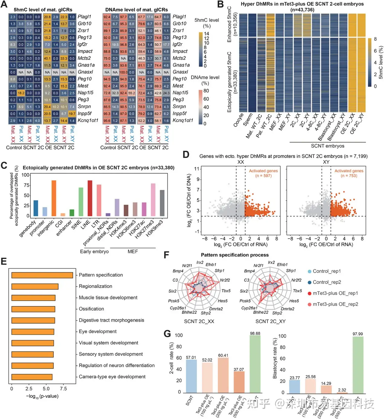 mTet3-plus过表达胚胎中,母本gICRs在2细胞期出现印记丢失(图8A),而正常SCNT中此过程延迟至囊胚期,说明异位5hmC可突破印记保护。在SCNT中沉默/低表达且在过表达基因组中激活,且启动子区5hmC异位生成伴去甲基化的胚胎中鉴定出雌性597个、雄性753个异常再激活基因(图8D)。GO分析显示这些基因富集于"模式特化"、"区域化"、"成骨化"等原肠运动后事件(图8E-F),表明2细胞期不应表达的晚期发育基因被过早激活。发育追踪显示,无论100、200或500 ng/μL剂量,mTet3-plus过表达均显著降低2细胞分裂率及囊胚形成率(图8G)。研究最终证明,5hmC的"精准调控"而非"整体提升"是SCNT成功的关键,异位羟甲基化会时序错乱地激活发育程序,导致胚胎在合子基因组激活(ZGA)阶段即失去发育协调性。