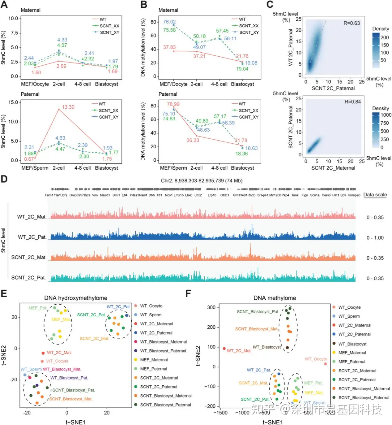 等位基因分辨率分析揭示了SCNT胚胎发育失败的特异性模式(图6A-B)。WT在2细胞期胚胎父本基因组5hmC达13.3%,母本仅2.69%,呈现典型不对称分布;而SCNT的雌雄胚胎均表现为亲本等位基因对称(约4-5%)(图6A)。在100 kb基因组范围内上,SCNT双亲本基因组的5hmC水平与彼此高度线性相关,且整体分布模式类似WT父本基因组但强度减弱(图6C-D)。t-SNE降维分析显示,SCNT 2细胞亲本基因组聚类于WT父本基因组附近,而远离WT母本基因组(图6E),表明无论DNA来源,卵胞质促进了"类精子"重编程。DNA甲基化分析显示类似对称性,且SCNT基因组从MEF到2细胞的甲基化水平和分布与WT精子到2细胞的父本基因组变化呈强线性相关,但去甲基化程度普遍更低。