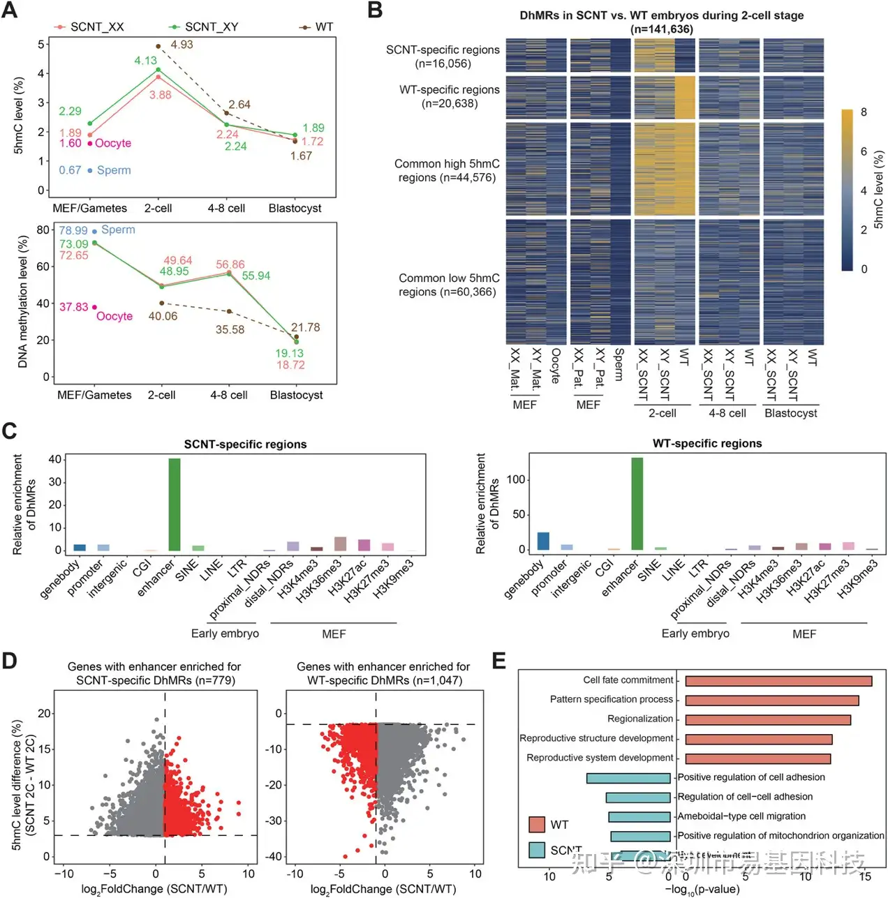 比较SCNT与WT胚胎发现,尽管受精卵5hmC起始水平低于体细胞,WT在2细胞期胚胎5hmC总量仍显著高于SCNT(图5A),表明重编程效率不足。SCNT特异性高甲基化在4-8细胞期尤为突出(图5A)。通过整合已发表WT胚胎数据,研究鉴定出四类DhMRs:SCNT特异区、WT特异区、共有高5hmC区和共有低5hmC区(图5B)。其中,SCNT特异5hmC区域羟甲基化升高,且伴随比WT更高的甲基化水平,提示"不完全重编程"状态。基因组特征分析显示,两类细胞特异性DhMRs均富集于增强子(图5C),且SCNT特异增强子关联基因显著下调,而WT特异增强子关联基因富集于细胞命运决定、模式形成等早期发育通路(图5D-E)。