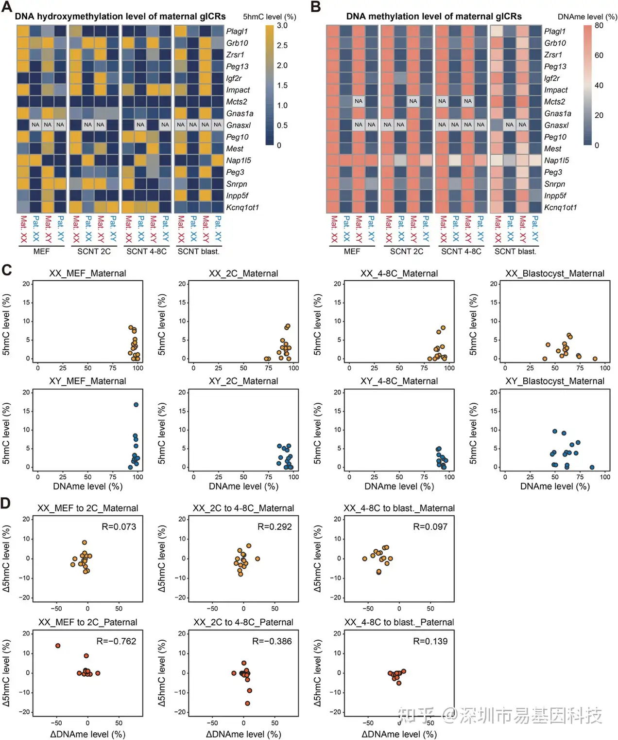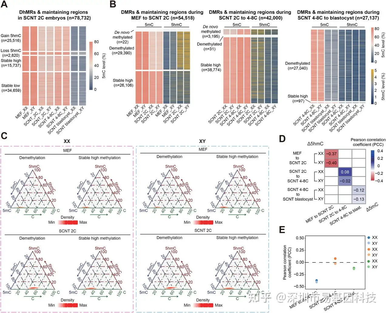 图2:SCNT囊胚前DNA羟甲基化与DNA甲基化动态的相关性