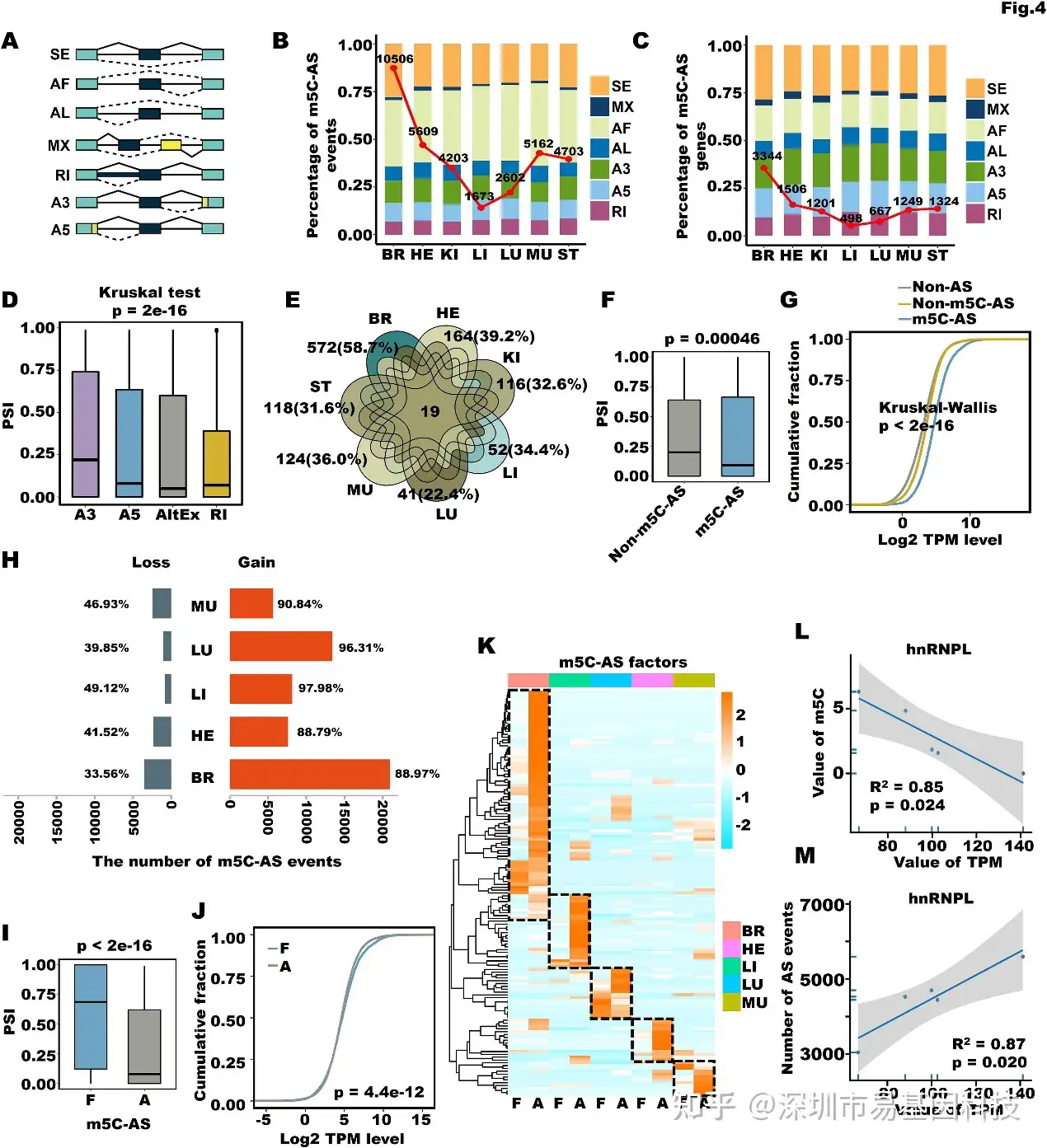 研究深入分析了胎儿和成体组织中的7类可变剪切(AS)事件(SE、AF/AL、MX、RI、A3/A5)(图4A),分析结果揭示,在所有七种组织中,m5C介导的AS事件广泛存在(图4B),并且具有高度的组织特异性(七个组织共有m5C-AS基因只有19个)(图4E)。重要的是,m5C介导的AS组剪切受体包含度(PSI)值低于非m5C介导的AS组(图4F),但其转录过程却更快(图4G)。