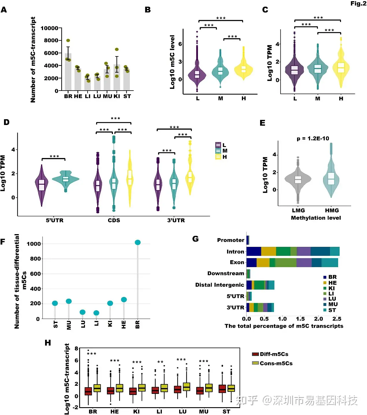 为深入解析m5C修饰对基因表达稳态的调控作用,研究通过整合m5C-Seq和RNA-seq数据,将m5C修饰转录本按甲基化水平分为低(L)、中(M)、高(H)三组(图2A)。结果显示,组织特异性越强的转录本其m5C修饰水平越稳定;m5C修饰水平越高的转录本,其基因表达的稳定性(稳态)也越高(图2B,2C)。这种稳定性与mRNA表达水平显著正相关(图2C),提示m5C修饰可能通过增强转录本稳定性来维持表达稳态。这种正相关性在mRNA的不同区域(5’UTR, CDS, 3’UTR)均存在(图2D)。
