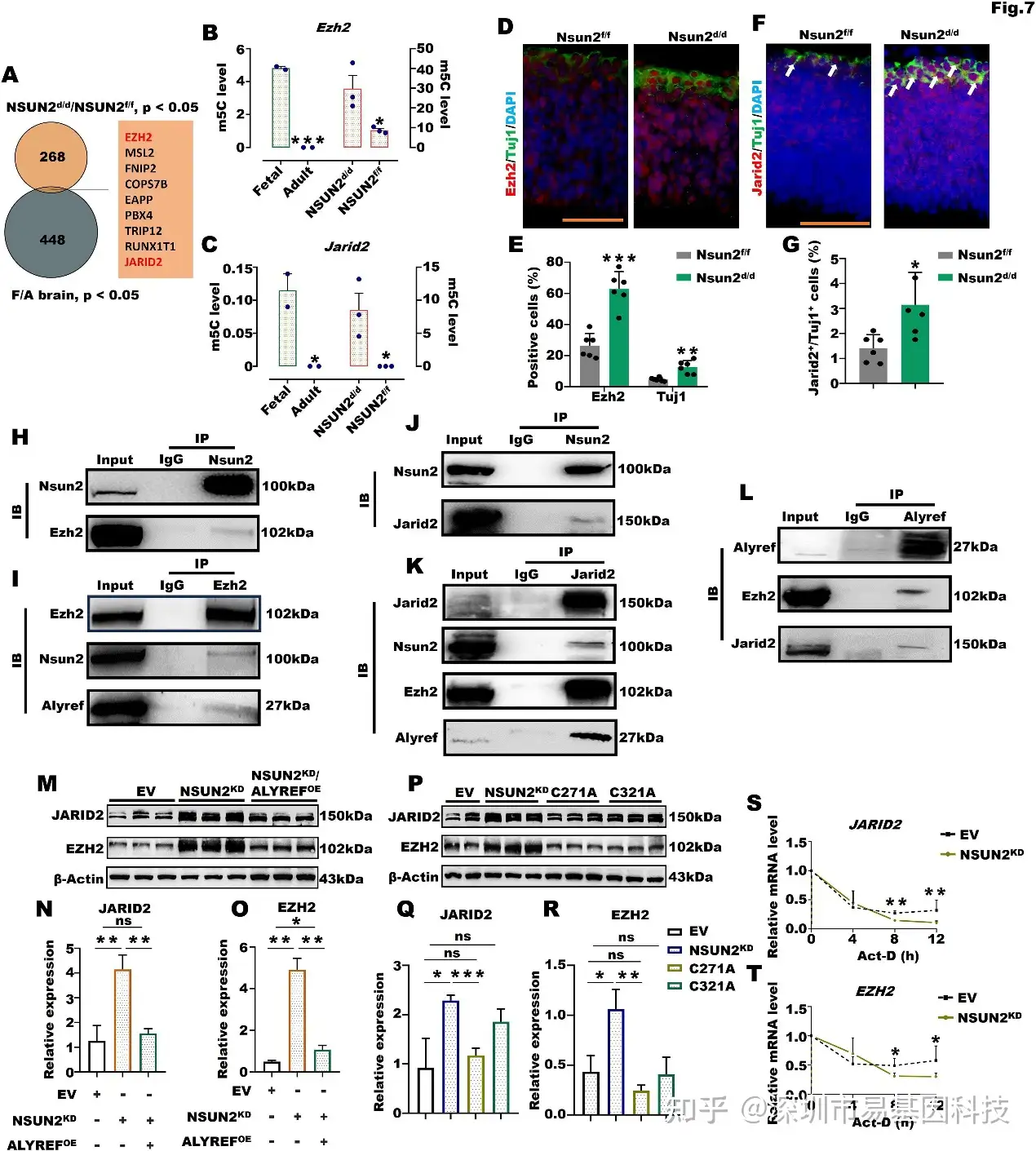 研究人员通过Venn交叉分析Nsun2敲除大脑中的差异m5C基因和胎儿大脑发育过程中的差异m5C基因,结果鉴定出两个关键靶点:组蛋白甲基转移酶Ezh2及其调控子Jarid2(图7A)。m5C RNA-BS数据显示,正常发育过程中和Nsun2敲除后的模型中,Ezh2和Jarid2的m5C水平均显著降低(图7-C),但蛋白水平却异常升高(图7D-G)。