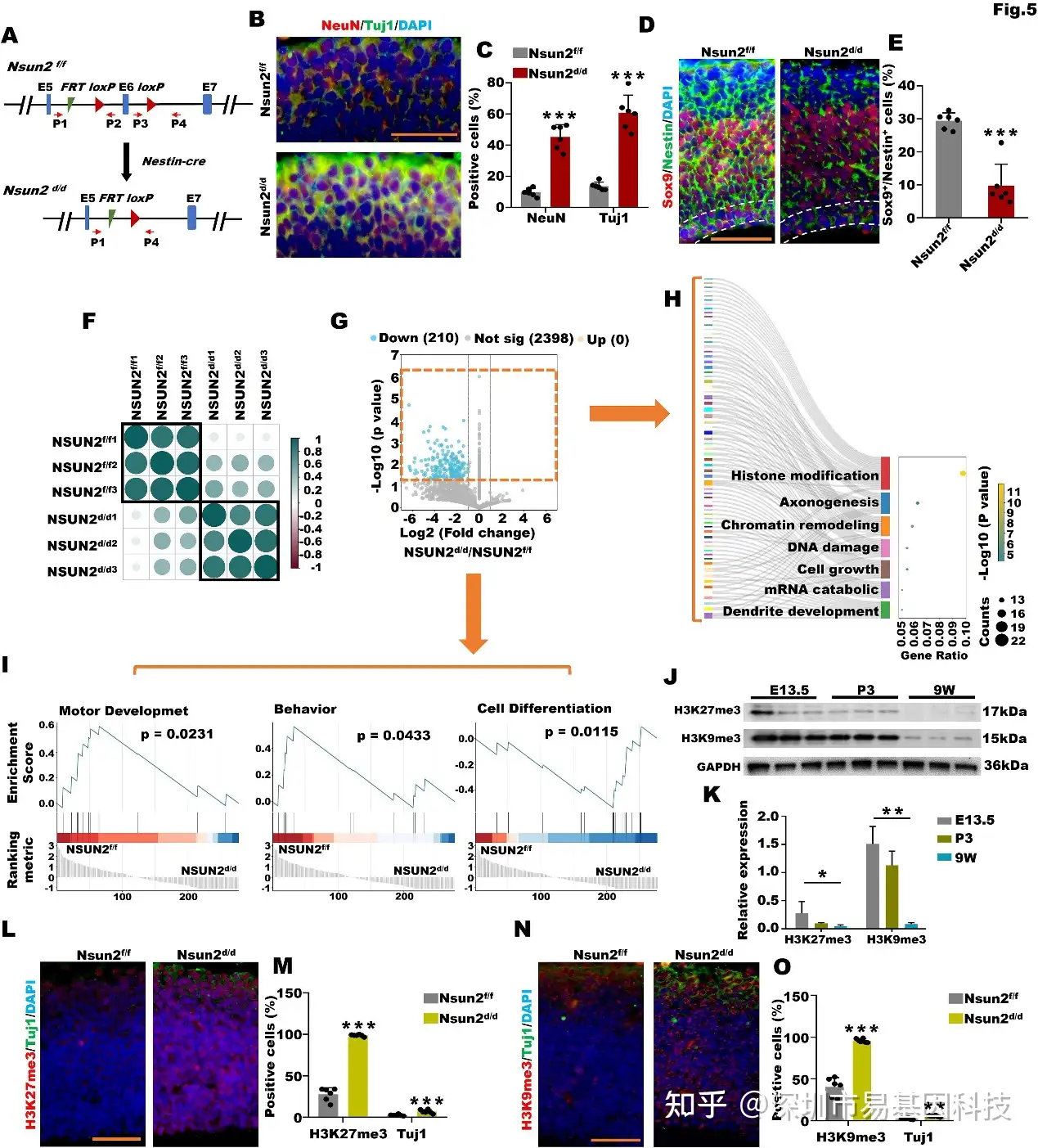 具体而言,Nsun2d/d胎儿脑组织的m5C RNA-BS显示修饰位点数量、修饰基因数和全局m5C水平均急剧降低,差异表达基因(DEGs)中下调基因显著富集于"组蛋白修饰"和"染色质重塑"通路(图5G-H)。GSEA分析显示运动发育、行为调控和细胞分化相关基因集显著抑制(图5I)。Western blot和IF证实Nsun2d/d导致H3K27me3和H3K9me3修饰水平异常升高(图5J-O),且该现象在9周龄成体脑中持续存在。