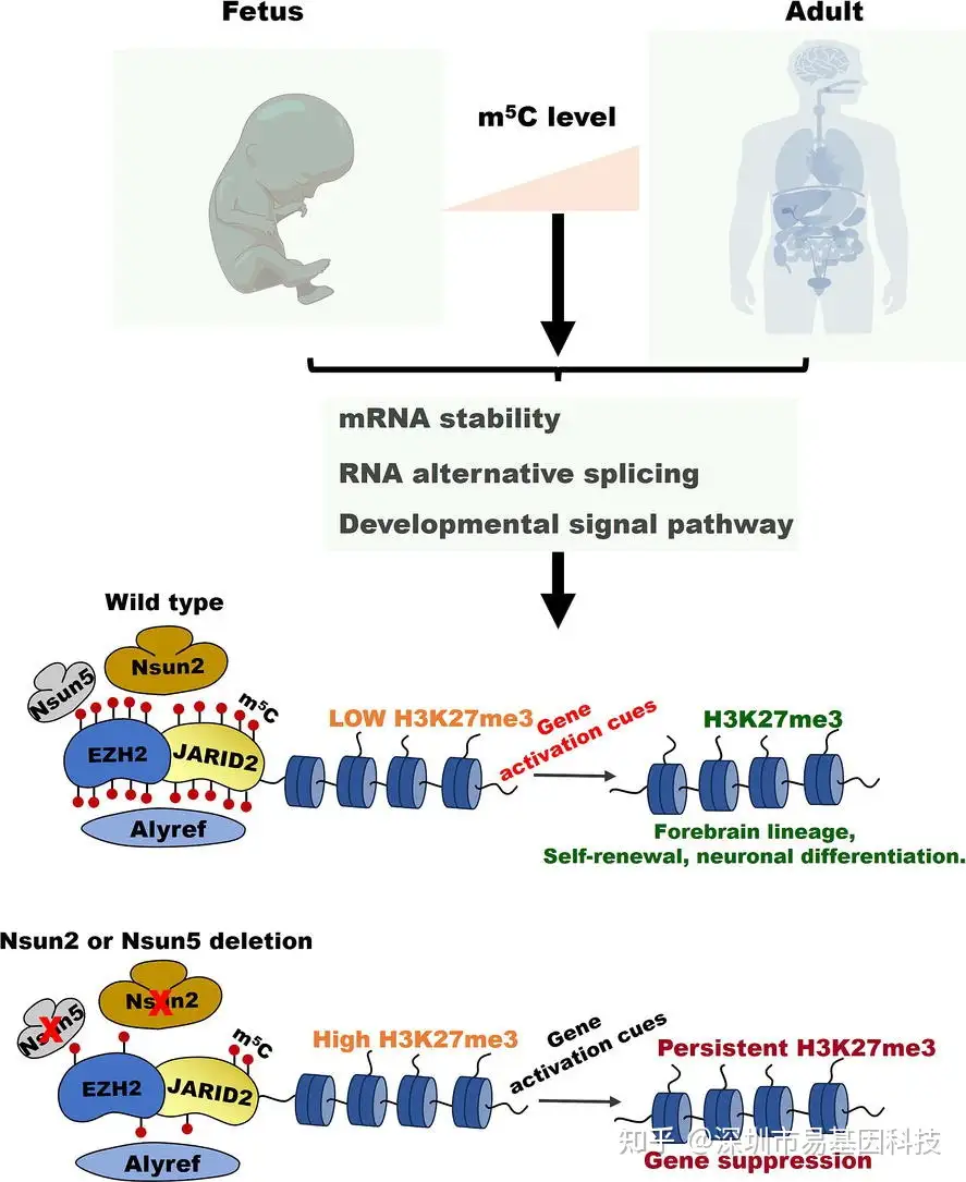 研究在建立首个人类胎儿组织m5C修饰的综合图谱并揭示其组织特异性甲基化模式的基础上,进一步证实m5C修饰的转录本主要通过可变剪切维持基因表达稳态,并调控关键发育转录机制。具体而言,研究者发现Nsun2先招募Jarid2/Ezh2复合体,后通过Alyref以m5C依赖性方式调控其活性,从而协调组蛋白修饰和染色质可及性,支持正常的胎儿发育。