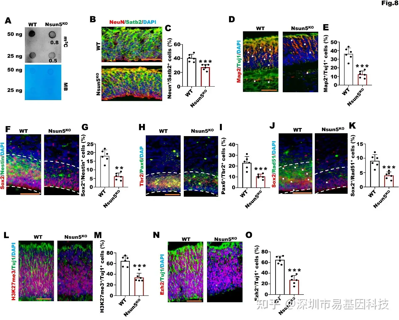 最后,研究探讨了另一m5C甲基转移酶Nsun5的功能,Dot Blot显示Nsun5敲除小鼠胎儿脑组织中整体m5C水平显著下降(图8A)。在E18.5期,Nsun5敲除导致成熟神经元标记物(NeuN/Satb2, Map2/Tuj1)阳性细胞比例减少(图8B-E),神经前体细胞(Sox2/Nestin)和DNA修复(Sox2/Rad51)相关标记物也减少(图8F-K)。同时,H3K27me3和Ezh2的阳性细胞比例增加(图8L-O)。这些结果表明Nsun5同样对胎儿脑组织发育至关重要,其缺失也会导致m5C水平降低和神经发育异常,但其具体作用机制可能与Nsun2/Alyref轴有差异,需要进一步研究。