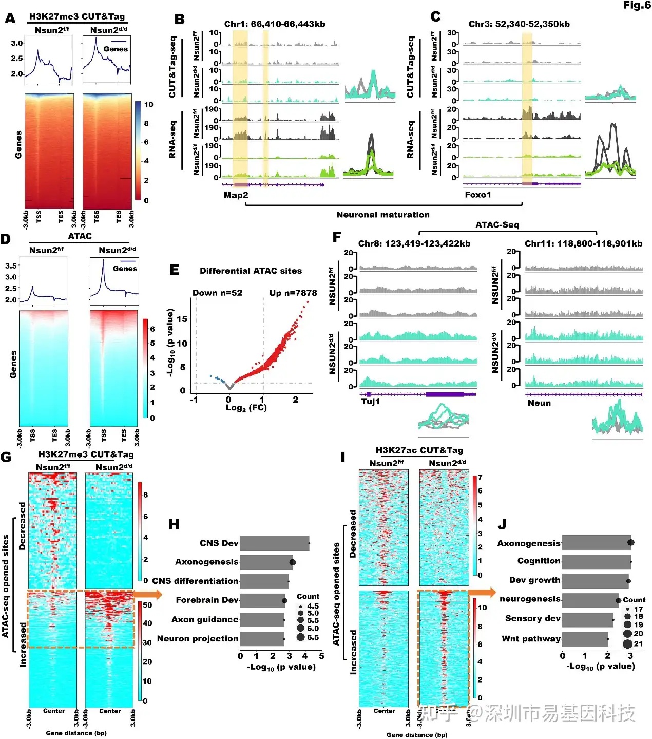 图6:Nsun2缺失影响了胎儿大脑发育过程中的组蛋白修饰和染色质可及性