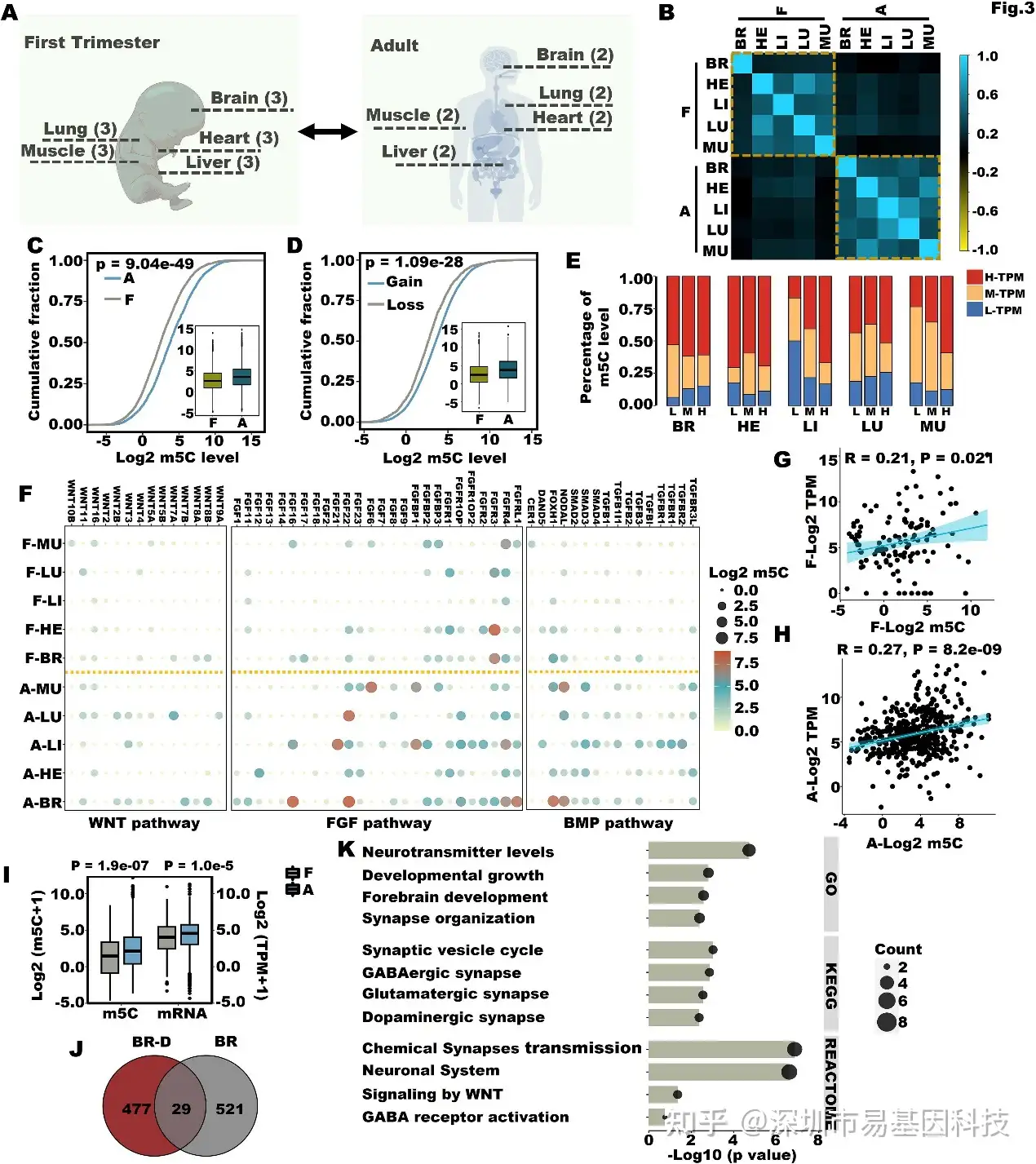 为探究m5C修饰的发育阶段动态变化,研究整合了已发表的成体组织m5C数据(5种匹配组织)进行比较分析(图3A)。聚类分析显示胎儿与成体组织阶段的m5C修饰基因存在实质性差异(图3B)。全局比较发现,尽管普遍认为成体甲基化水平更高,但胎儿组织在关键发育基因上的m5C富集度呈现独特的分布模式:胎儿大脑组织的m5C水平在FGF、WNT、BMP等神经发育核心通路中显著偏高(图3F)。并进一步发现“获得性m5C基因”(发育过程中修饰水平上升)数量超过丢失性基因(修饰水平下降)(图3D),且m5C水平变化与mRNA表达呈正相关(图3E, G-H)。