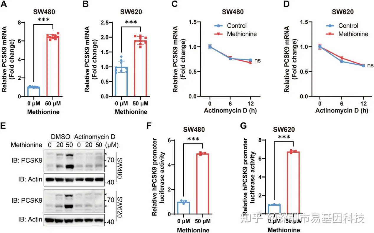 为揭示调控层级,研究团队转录调控分析揭示了甲硫氨酸补充显著升高SW480/SW620细胞PCSK9 mRNA水平(图2A-B)。放线菌素D阻断实验表明,甲硫氨酸不改变PCSK9 mRNA稳定性(图2C-D),但转录抑制剂可完全消除其诱导效应(图2E),证实调控发生在转录起始阶段。通过构建-900 bp至-1 bp的PCSK9启动子荧光素酶报告质粒,证实甲硫氨酸与SAM显著增强启动子活性(图2F-G)。上述研究结果揭示了甲硫氨酸通过激活转录而非稳定mRNA或蛋白来上调PCSK9。