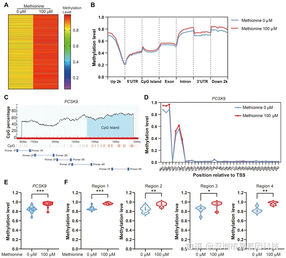 有趣的是,虽然甲硫氨酸能上调PCSK9,但Target-BS分析显示PCSK9启动子区域甲基化水平并无变化(图5C-D),而其基因体区域甲基化水平升高(图5E-F),提示基因体甲基化可能参与表达调控。
