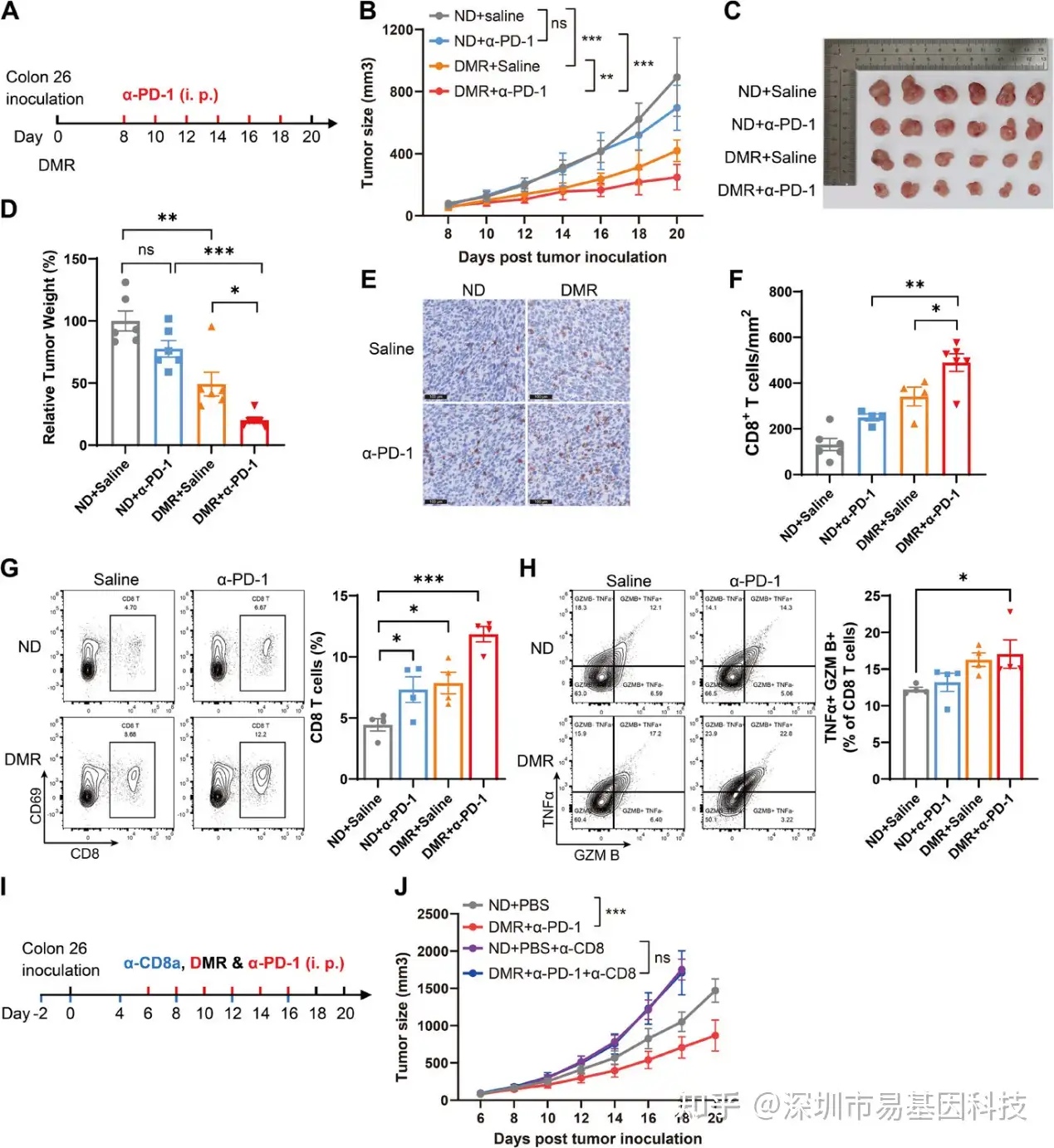 在机制明确的基础上,研究进入临床前治疗验证。在对抗PD-1治疗原发耐药的MSS Colon 26荷瘤小鼠模型中,单独使用抗PD-1抗体或DMR均有一定抑瘤效果,但两者联合治疗产生了显著的协同作用,极大地抑制了肿瘤生长(图6A-D)。免疫分析显示,DMR能促进肿瘤内CD8+ T细胞浸润,与抗PD-1联用后效果更强(图6E-G),且改善T细胞效应功能(图6H)。更重要的是,当使用抗体耗竭体内的CD8+ T细胞后,DMR的抗肿瘤效果完全消失(图6I-J),证明DMR的疗效完全依赖于CD8+ T细胞。上述研究结果为通过饮食干预改善免疫治疗提供了直接证据。