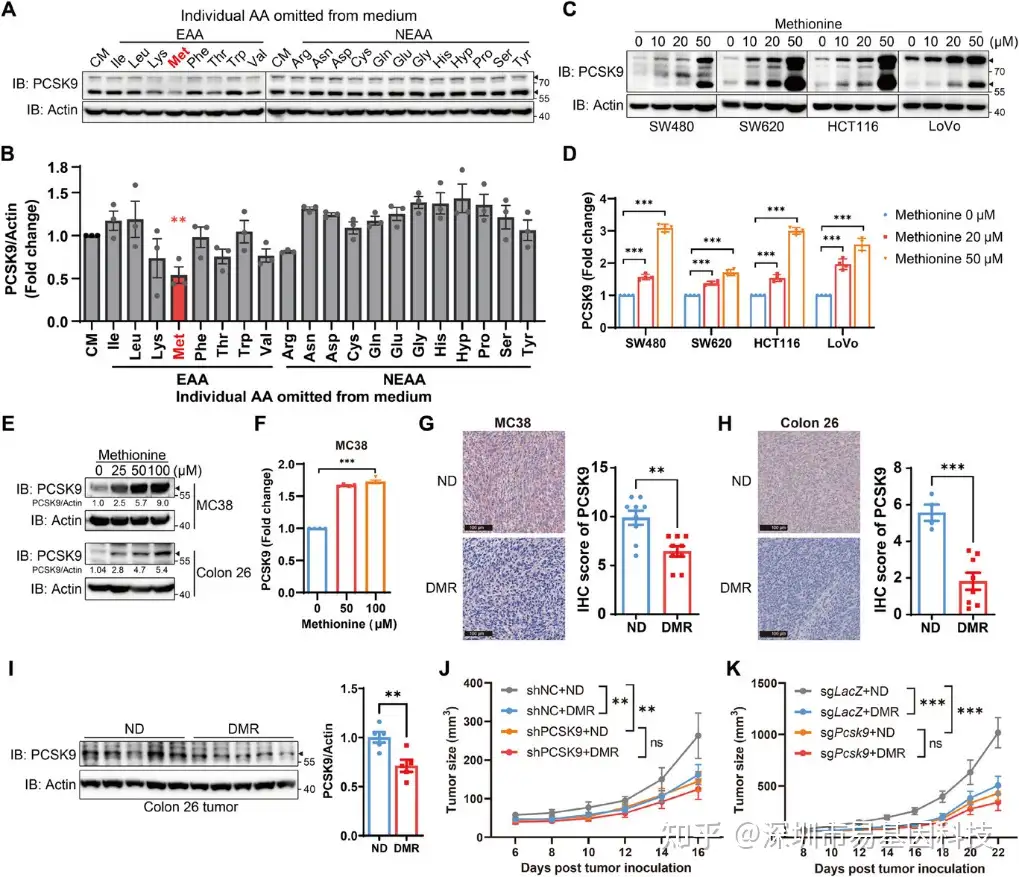 研究者首先在体外模拟肿瘤微环境氨基酸缺失状态,发现甲硫氨酸缺失对SW480原发灶和SW620转移灶来源的人结直肠癌细胞PCSK9蛋白表达的抑制最为显著(图1A-B)。补充甲硫氨酸(50 μM)可剂量依赖性地上调人源及鼠源CRC细胞系(HCT116、LoVo、MC38、Colon 26)的PCSK9表达与分泌(图1C-F)。为验证体内相关性,研究团队构建MC38(C57BL/6)和Colon 26(BALB/c)同源移植瘤模型,采用0.12%甲硫氨酸的DMR饮食干预,证实肿瘤组织PCSK9蛋白(免疫组化与Western blot)显著降低(图1G-I)。该组织特异性现象提示CRC中存在特异性甲硫氨酸-PCSK9调控轴。