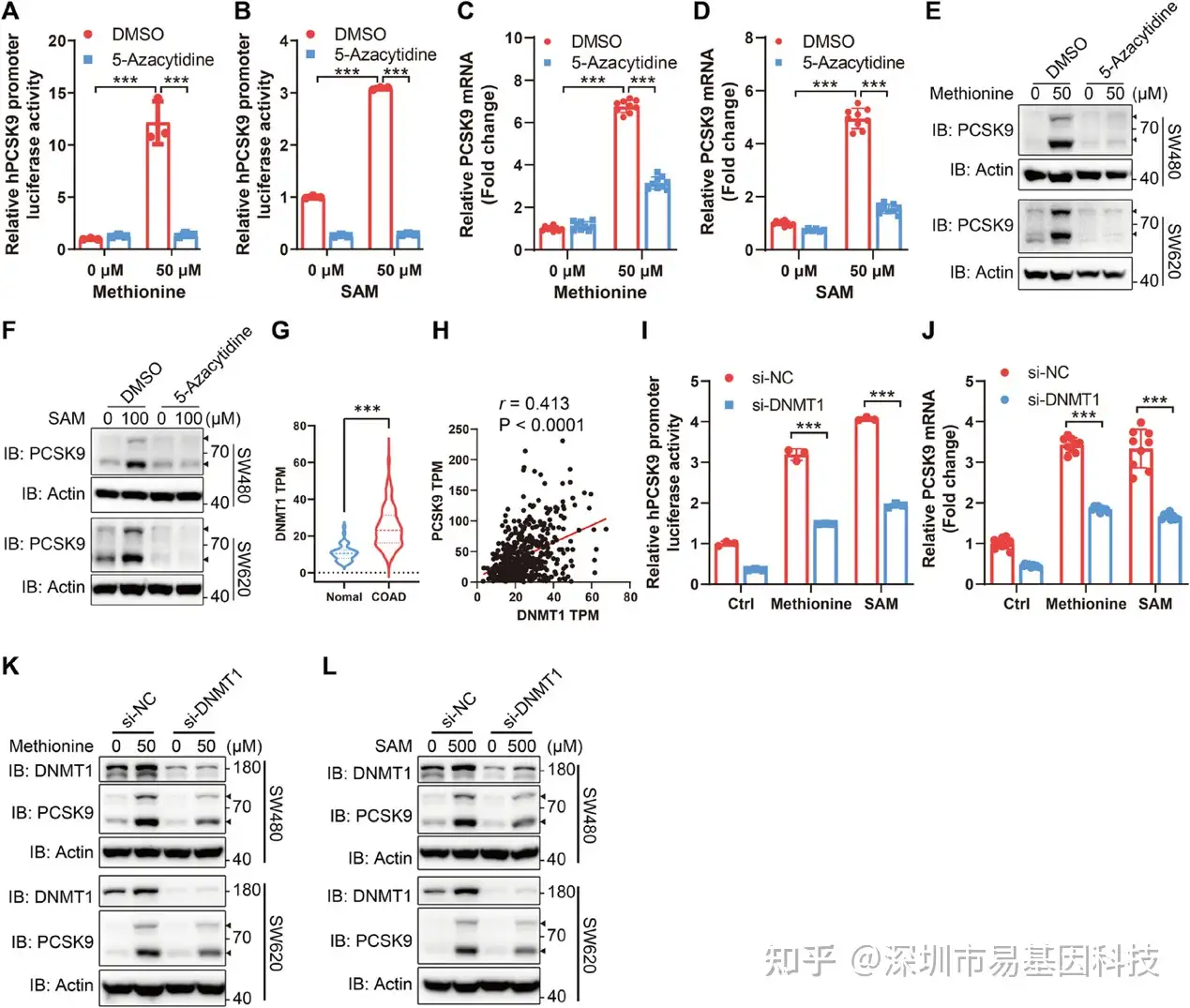 SAM是DNA甲基化的主要甲基供体。研究团队发现,使用DNA甲基化抑制剂5-氮杂胞苷处理可以抑制甲硫氨酸和SAM对PCSK9启动子活性、mRNA和蛋白水平的促进作用(图4A-F)。在多种DNA甲基转移酶中,DNMT1(负责维持甲基化)在CRC肿瘤组织中高表达,且与PCSK9表达强相关(图4G-H)。敲低DNMT1能显著抑制甲硫氨酸或SAM对PCSK9表达的诱导作用(图4I-L)。这些结果证明,甲硫氨酸/SAM通过DNMT1介导的DNA甲基化通路来促进PCSK9转录。