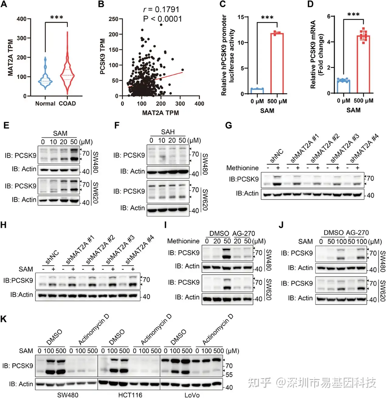 甲硫氨酸进入细胞后的关键代谢通路是转化为通用甲基供体SAM。研究团队对TCGA数据库的分析显示,在CRC肿瘤组织中,催化SAM合成的限速酶MAT2A的表达与PCSK9的表达呈显著正相关(图3A-B)。功能实验证实,直接补充SAM可以模拟甲硫氨酸的效果,增强PCSK9启动子活性和mRNA表达(图3C-D)。在甲硫氨酸剥夺的培养基中,补充SAM(而非其下游产物SAH)可以恢复PCSK9的表达(图3E-F)。而敲低MAT2A或用其抑制剂AG-270处理,能阻断甲硫氨酸(但不能阻断SAM)对PCSK9的上调作用(图3G-J)。同样,放线菌素D也能阻断SAM诱导的PCSK9上调(图3K)。这些证据链清晰地表明,甲硫氨酸需要通过MAT2A催化转化为SAM,进而促进PCSK9的转录。