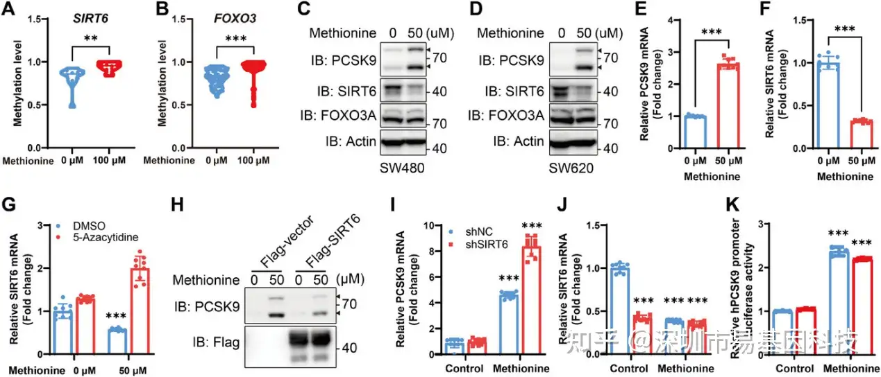 为鉴定出受甲硫氨酸/SAM/DNMT1甲基化通路调控及影响PCSK9转录的关键因子,研究者对甲硫氨酸处理前后的SW480细胞进行了RRBS分析。结果显示,甲硫氨酸补充普遍提高了大多数基因在不同区域的甲基化水平(图5A-B)。研究人员特别关注抑制PCSK9转录的因子SIRT6及其转录激活因子FOXO3。RRBS和后续验证发现,甲硫氨酸处理增加了SIRT6和FOXO3基因区域的DNA甲基化(图6A-B),并导致SIRT6(而非FOXO3)的蛋白和mRNA水平下降(图6C-F)。使用5-氮杂胞苷可以逆转甲硫氨酸对SIRT6 mRNA的抑制(图6G)。功能实验表明,过表达SIRT6能部分阻断甲硫氨酸对PCSK9上调(图6H),而敲低SIRT6则能增强这种上调作用(图6I-J)。