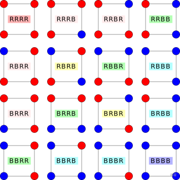 显然四个珠子对应着 \(A\),红色和蓝色对应着 \(B\)。不考虑本质不同,显然项链的染色方案共计 \(2^4=16\) 种,这 \(16\) 种染色方案对应着 \(X\)。将可以通过旋转相互得到的分到一组,共计 \(6\) 组,如下图所示: