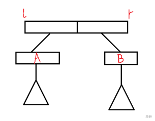 假设将 \((l,r)\) 分成了如上区间(A 和 B),A 和 B 是递归的最后一层,也是打 tag 的两个节点。