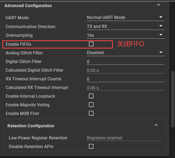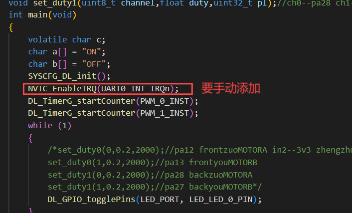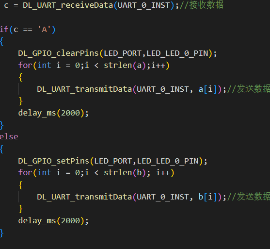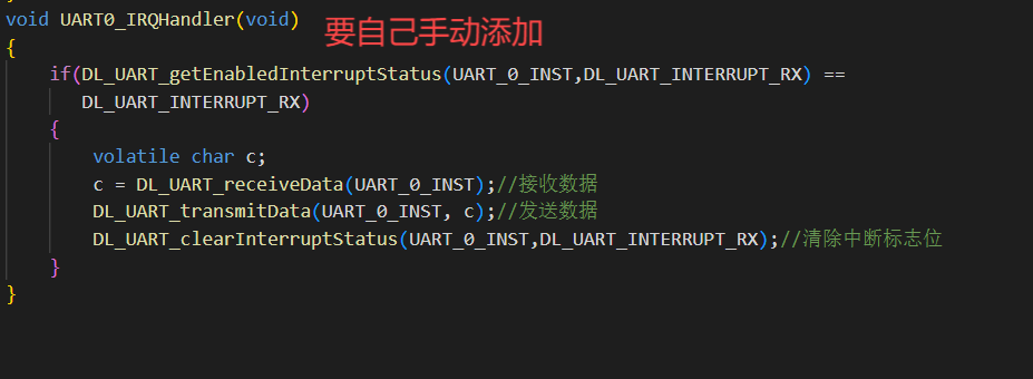 void UART0_IRQHandler(void) { if(DL_UART_getEnabledInterruptStatus(UART_0_INST,DL_UART_INTERRUPT_RX) == DL_UART_INTERRUPT_RX) { volatile char c; c = DL_UART_receiveData(UART_0_INST);//接收数据 DL_UART_transmitData(UART_0_INST, c);//发送数据 DL_UART_clearInterruptStatus(UART_0_INST,DL_UART_INTERRUPT_RX);//清除中断标志位 } }