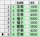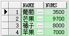 1 create table demo(id int,name varchar(20),nums int); ---- 创建表 2 insert into demo values(1, '苹果', 1000); 3 insert into demo values(2, '苹果', 2000); 4 insert into demo values(3, '苹果', 4000); 5 insert into demo values(4, '橘子', 5000); 6 insert into demo values(5, '橘子', 3000); 7 insert into demo values(6, '葡萄', 3500); 8 insert into demo values(7, '芒果', 4200); 9 insert into demo values(8, '芒果', 5500);