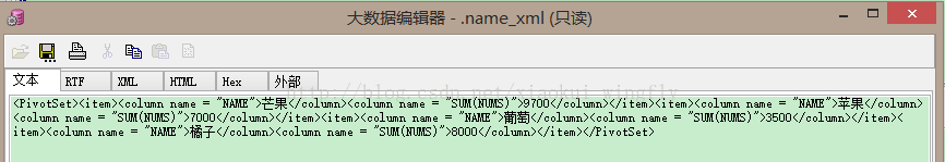 如您所见,列 NAME_XML 是 XMLTYPE,其中根元素是 <PivotSet>。每个值以名称-值元素对的形式表示。您可以使用任何 XML 分析器中的输出生成更有用的输出。