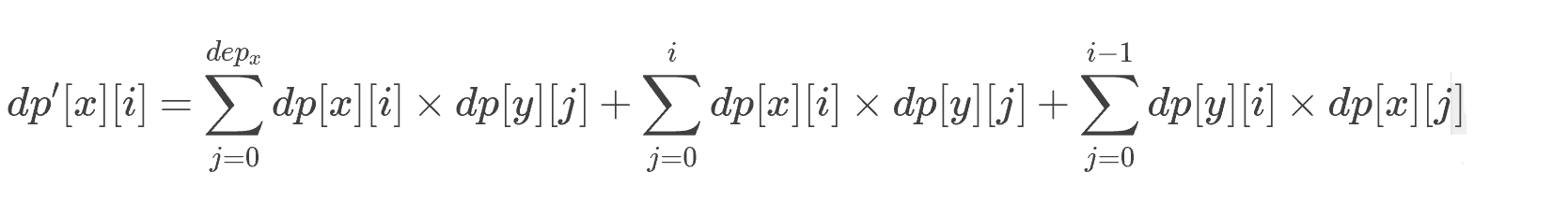 令 dp[i][j] 表示以i为根的子树,从根节点到深度为j的祖先路径上的每条边都要赋值为0的方案数。