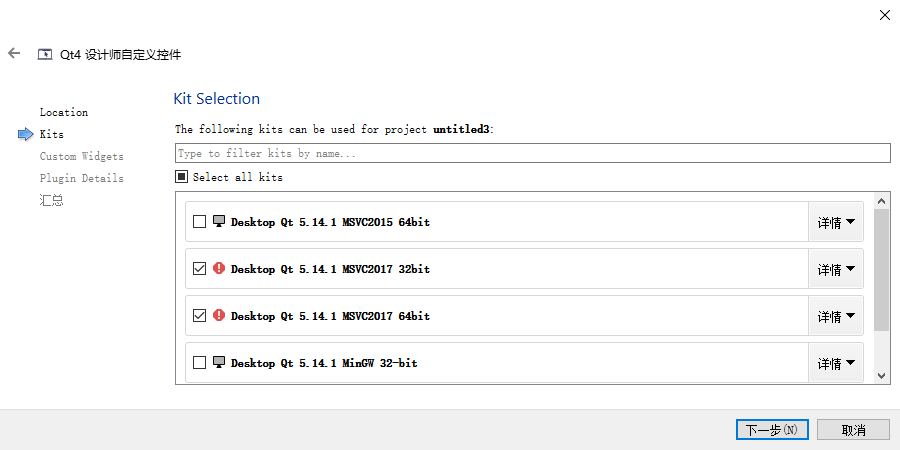选择编译器版本(注意,选择的其中一个版本是自己要使用这个插件的项目的版本,一个是Qt Creator工具的版本比如我的电脑里面是MSVC2017 32bit)